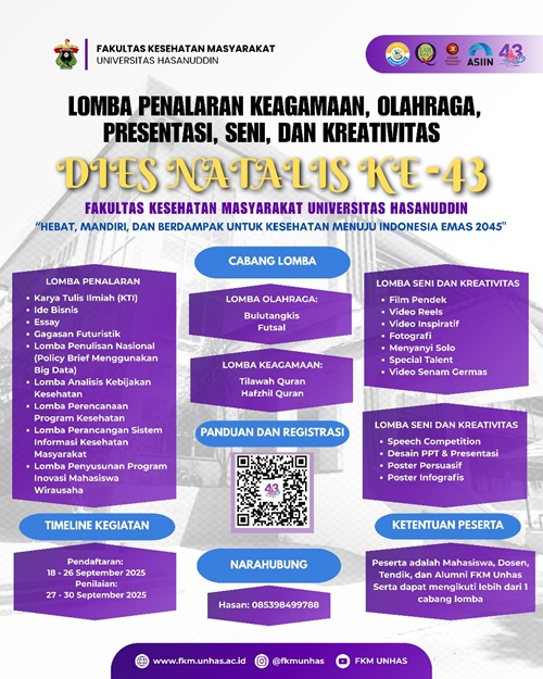 Yuk, ramaikan perayaan Dies Natalis Fakultas Kesehatan Masyarakat Universitas Hasanuddin ke-43 dengan mengikuti berbagai lomba seru dari penalaran, olahraga, seni, kreativitas, hingga keagamaan TimelinePendaftaran: 18–26 September 2025Penilaian: 27–30 September 2025 Info & Registrasi: Scan QR pada poster atau hubungi Hasan (0853-9849-9788) Tunjukkan bakat, prestasi, dan semangatmu untuk meriahkan tema “Hebat, Mandiri, dan Berdampak untuk Kesehatan Menuju Indonesia Emas 2045.” DiesNatalisFKMUnhas43 #FKMUnhas #Kreativitas #Penalaran #Olahraga #Keagamaan #Seni #Unhas #unhaskubersatu #unhaskukuat #fkmunggul